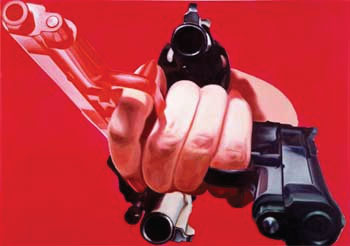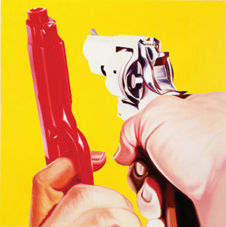 1996 Exhibits new gun paintings in solo exhibitions at the Galerie Thaddaeus Ropac, Paris, and Salzburg, Austria, and at Feigen Incorporated, Chicago. New Paper Constructions is shown at Gemini G.E.L., Los Angeles, California. F-111is acquired by the Museum of Modern Art, New York.