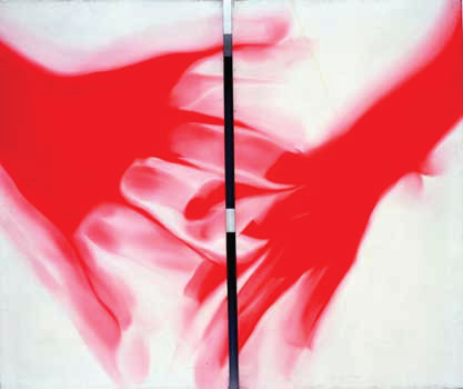 1961 Paints Zone(1960-61), his first studio painting to employ commercial painting techniques and fragmented advertising imagery.