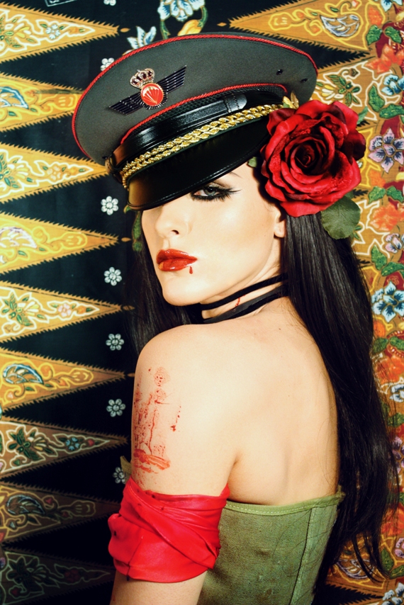 Who is this girl? A lethal vigilant? A crusader of justice? Maybe. A military-fixated fashionista ready to serve her country as a modern day Vargas girl? Fer sure. I don’t want my picture on a frame. I gotta have the front page. She’s like Elektra Natchios meets La Lupe. Her rebellious dance pop is badass and she kills whenever she takes the stage. And, she definitely likes her cosmic blue cat suits. They help minimize the chances of her inadvertently harming someone.