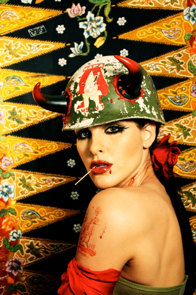 Nice quote, except that Zayra does not prance. She commands. She sports the peaked cap of an army officer and wears it like a crown, not a disguise or costume. Rather, a symbol of respect and she urges it on. Maam, yes, maam. But she’s no situation room general. She thirsts for the action, and the stage is her battlefield. In horned helmet she is ready for war. She’s in for the fight and a little blood does not scare Zayra. As long as it’s applied as impeccably as her make-up. Baby likes to bang. Bang, bang, bang. But, don’t fuck with her make-up.